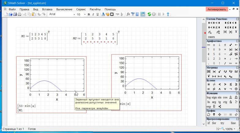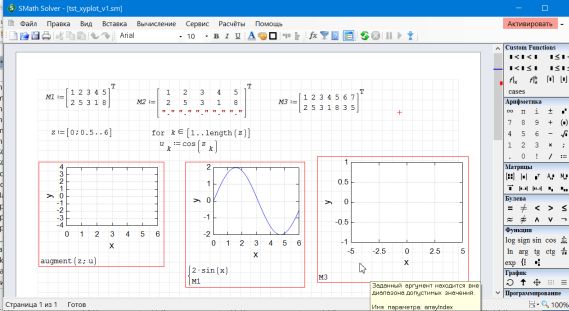 I just started to use SMath. I have problems with X-Y Plot. I want to plot a table (a set of values), or several tables, but the program gives error "The argument provided is out of the interval of the allowed values. Name of the parameter: array/index" (translated to English). I can do such a plot in old versions of SMath, but not in the current one. I have SMath ver. 1.3.0.9126, extension X-Y Plot Region ver. 0.3.9106.25707. I also tried some examples from this thread, some of them also do not work, see attached '2D Plot - Axis Control_r1.sm'