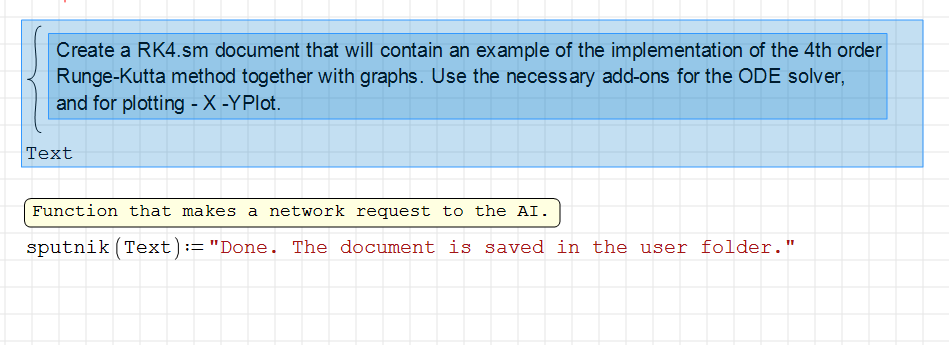 Hi Martin. You can try this code utility ( https://smath.com/en-US/forum/topic/GbopVw/Code-utility#msg137576 ) for scripting SMath functions. By relying on plain text, the AI will be able to provide some form of useful source code for basic applications.