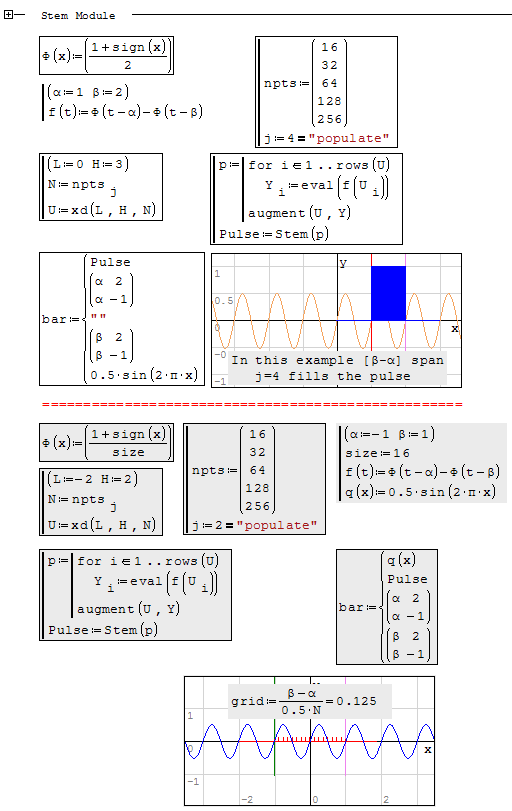 SMath Forum SMath Studio Samples Bar/Stem/Locate 1 Pages (1 items) Bar/Stem/Locate - Bar/Stem/Locate - Messages Go to last post #1 Posted: 7/17/2016 8:07:47 PM Jean Giraud 983 likes in 6,866 posts. Group: User If the stems are serrated enough, the plot will look like solid bar.The vertical extension is adjusted by the denominator of "signum'.Jean2D Plot Stem_Bar Locate Pulse.sm (24.4 KiB) downloaded 742 time(s). 1 Pages (1 items) New Posts No New Posts