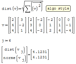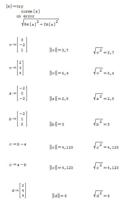 I want to calculate the magnitud or modulus of a vector. In mathcad I think is something like the name of the vector between four stripes.Thank you.