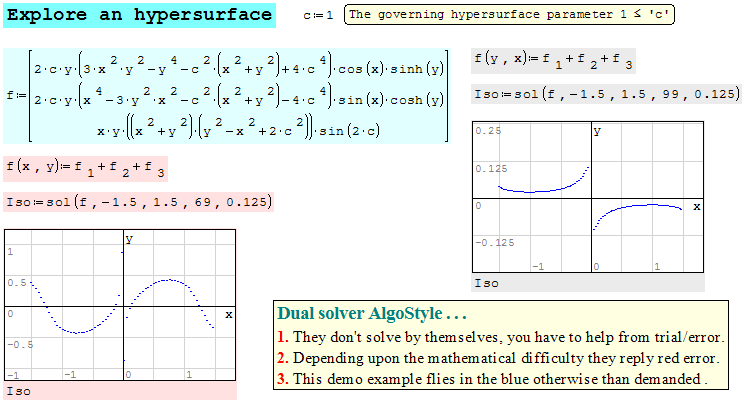 SMath Forum SMath Studio Samples roots(2) solve(4) 1 Pages (3 items) roots(2) solve(4) - roots(2) solve(4) - Messages Go to last post #1 Posted: 10/25/2018 1:34:30 AM Jean Giraud 983 likes in 6,866 posts. Group: User Doing the same task, roots(2) is ~ 7 times faster than solve(4).Maybe like this: from the Mach project, roots solves on the canvas,conclusively: it auto-seeds [my own answer].Contour Solve Isocurve.sm (17.08 KiB) downloaded 814 time(s). 1 users liked this postAlvaro 10/25/2018 5:36:00 AM #2 Posted: 10/25/2018 5:57:24 AM Alvaro 1,080 likes in 1,752 posts. Group: User Hi Jean. Try this.Contour Solve Isocurve.sm (29.23 KiB) downloaded 801 time(s).Best regards.Alvaro. #3 Posted: 10/25/2018 12:51:53 PM Jean Giraud 983 likes in 6,866 posts. Group: User WroteHi Jean. Try this.Coding not compatible ... shit !This version was created SS 5346 ... OK 6179Cheers ... JeanContour Solve Isocurve AlgoStyle.sm (15.14 KiB) downloaded 818 time(s). 1 Pages (3 items) New Posts No New Posts