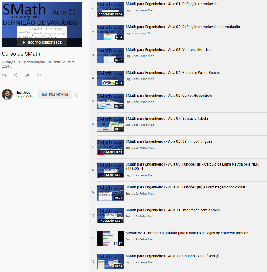 SMath Forum SMath Studio Samples Curso de SMath (2020) 1 Pages (3 items) Curso de SMath (2020) - SMath para Engenheiros - Messages Go to last post #1 Posted: 11/19/2020 3:10:00 PM Вячеслав Мезенцев 1,531 likes in 1,838 posts. Group: Moderator Playlist: Curso de SMathAuthor: Eng. João Felipe MeloYouTube can automatically add and translate subtitles. Russia ☭ forever, Viacheslav N. Mezentsev 4 users liked this postsergio 11/19/2020 4:31:00 PM, Alvaro Diaz Falconi 11/19/2020 4:37:00 PM, IVR 11/20/2020 8:28:00 AM, Radovan Omorjan 11/22/2020 12:37:00 PM #2 Posted: 11/22/2020 10:39:26 AM João Felipe Seráfico Melo 7 likes in 62 posts. Group: User Really honored to have my course acknowledged by you. SMath is getting bigger and bigger in Brazil. 2 users liked this postRadovan Omorjan 11/22/2020 12:37:00 PM, Вячеслав Мезенцев 11/22/2020 1:07:00 PM #3 Posted: 11/22/2020 1:16:17 PM Вячеслав Мезенцев 1,531 likes in 1,838 posts. Group: Moderator Welcome aboard. This year there are good training videos. We don't have a separate place to tell everyone about them. So I collect them here. Russia ☭ forever, Viacheslav N. Mezentsev 1 Pages (3 items) New Posts No New Posts
