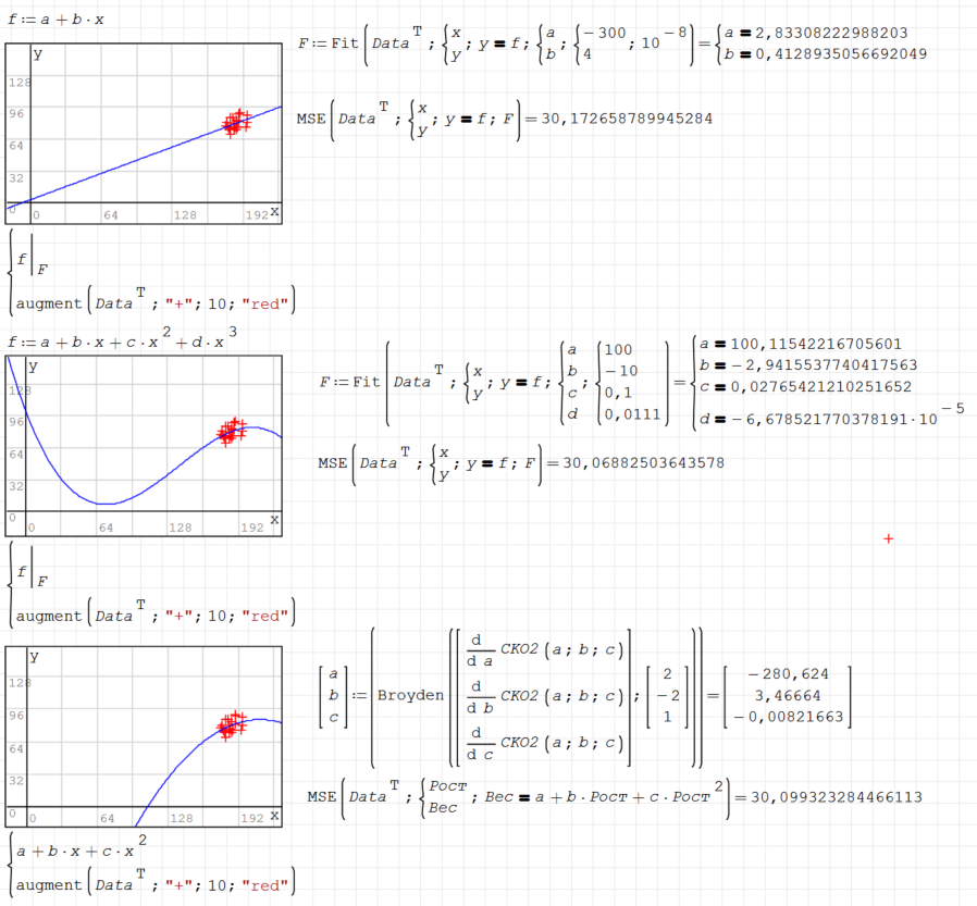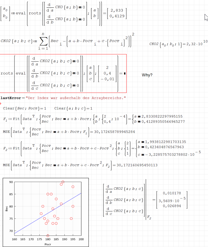 Hi Valery. Martin showed why. But for the quadratic case Máxima's Fit function does not return the same result as Excel, which could be said to have been taken as standard, since they are also the same as those usually obtained with the 'all powerful' (talking about of gods) a\b of Matlab. I made the post to show how those mythical values can also be obtained in SMath.