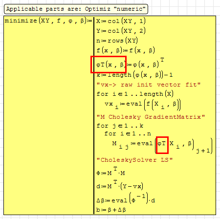 φ(x,β) is a vector and for calculations inside Jean's minimize() there aren't reasons to have it transposed, since linear indexing is used inside these loops); - a more general solution (f.e. if you need transposed vector for matrix multiplication) is to assign the transposed function to a function with a different name: φT(x,β):transpose(φ(x,β))