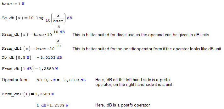 WroteIf Davide could provide operator forms for To_dB() and From_dB() then this could pretty much look like in Mathcad.