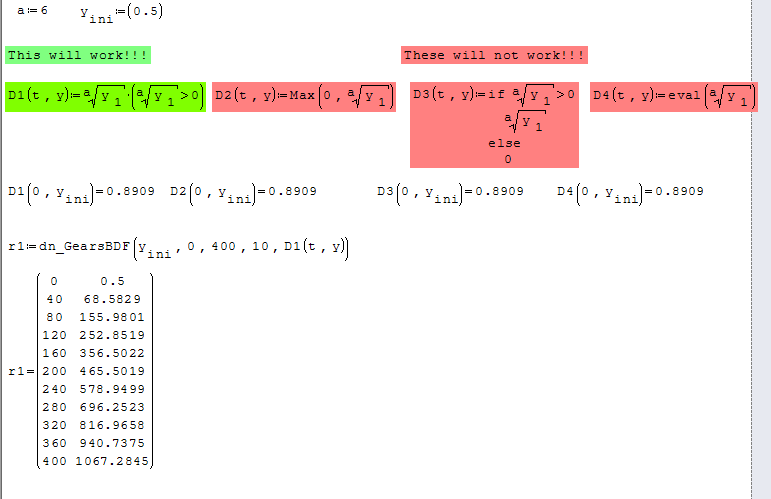 QuoteI tried to define function D as a multiline function but this will not work”, and I believe that the following posts up to #14 were about this subject. As far as I understand the comment from omorr in #14 is still valid? “It seems, as you mentioned, that Rkadapt will not work with multiline function. . . . I also tried to define function f(x,t) by using "eval" - it does not work either with rkfixed or Rkadapt. Due to my previous experience, I thought it would not work. I know that this kind of functions, like you did with rkfixed and Rkadapt, will have troubles due to the SMath way of working