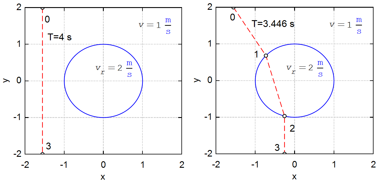 The hare needs to hide in the forest from the dogs as quickly as possible. A hare with speed v starts running at the edge of the field along the lawn from point 0. Behind the field there is a saving forest (point 3), the distance to which is equal to Δ (width of the field). The cunning hare does not run straight to the forest, but diagonally to a round area (point 1), located in the middle of the field. This could be, for example, an agricultural aviation helipad with a smooth concrete surface, where a hare can run faster - at vr speed. The hare at point 1 abruptly changes the direction of its run, crosses a circular area along a chord, runs out of it with another change of direction (point 2) and finishes in the forest along the shortest path (point 3). Determine the running trajectory of the hare - the coordinates of points 1 and 2 at which the running time will be minimal. The origin point is at the center of the circle.