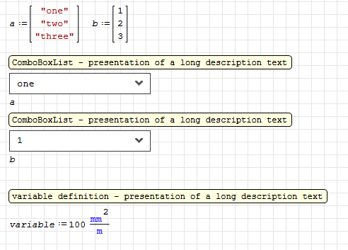 WroteWroteThe first one probably does not relate to the SMath Viewer itself, but the ComboBoxList extension. The longer description of the list does not fit into the window, making it unreadable (as shown below). This happens when the list contains text elements. Working with numbers does not cause this problem.