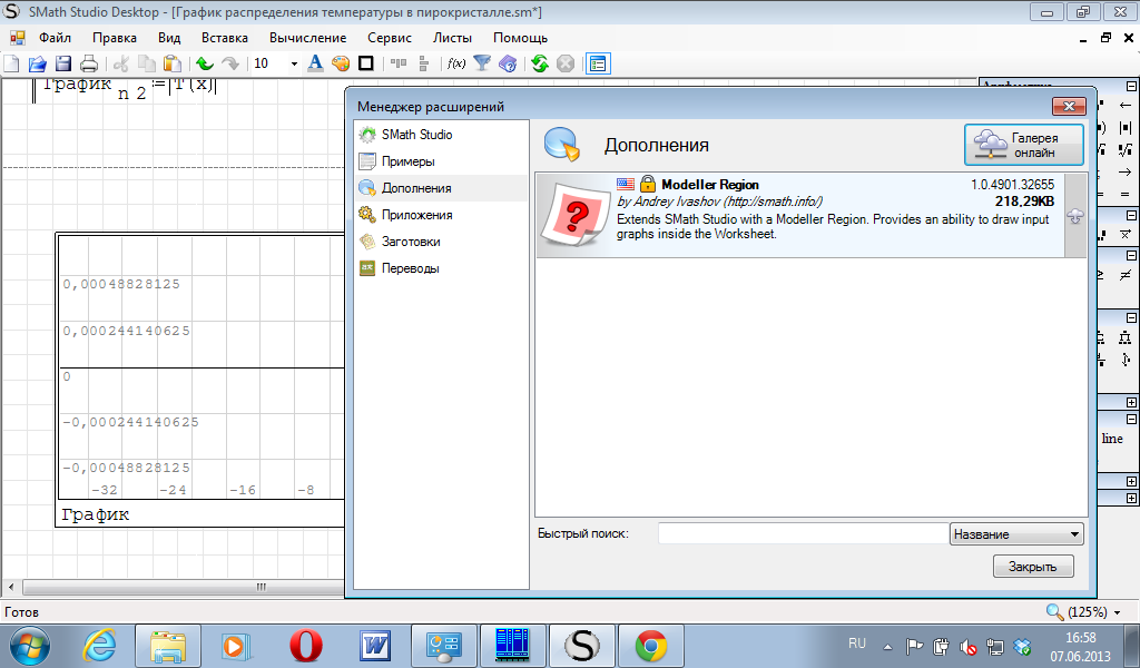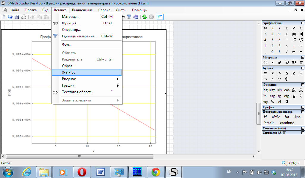 Уни, спасибо. Мой график как раз так и должен выглядеть, однако у меня файл не работает, т.е. программа выдает следующие ошибки при открытии (на скриншотах). Я удалил полностью предыдущую версию и установил 0.96.4902 со всеми плагинами. XYPlotRegion.dll уже был. Я открыл файл "График распределения температуры в пирокристалле.sm", но Вашего графика я не увидел, а своими силами я сделал график так, как на скриншоте. Подскажите, пожалуйста, где находится форматирование графиков и как Вам вообще удалось этот график построить? Я выбираю Вставка - График - Двумерный (2D), после чего в левом нижнем углу появляется пустой маркер, который надо заполнить. Согласно http://ru.smath.info/forum/yaf_postst26_Postroieniie-ghrafikov-funktsii.aspx в этот маркер надо вписывать саму функцию, т.е. выражение, стоящее справа от знака ":=". Мне стыдно уже спрашивать, но у меня, правда, с этим моим графиком ничего не получается. Получается только, если я задам в том маркере что-нибудь простое, типа "5*х".