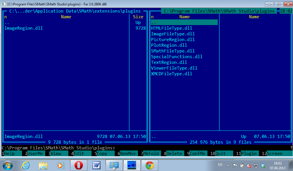 Все сделал, как Вы сказали: удалил программу, через shift-delete удалил все из Program Files\SMath и \Application Data\SMath. Установил указанную Вами ночную сборку. Все встало нормально. При запуске Вашего файла было предложено установить не X-Y plugin, а Image Region plugin. Плагин установился, файл открылся в том же виде без самого графика. Я закрыл программу и скопировал принудительно плагин X-Y в папку \Application Data\SMath, но программа при запуске выдала ту же ошибку, что на скриншоте с фаром в предыдущем моем сообщении. Я принудительно удалил этот плагин, и сейчас скриншотом показываю, где и какие плагины у меня установлены и что мне делать дальше? (плагин X-Y я взял отсюда ftp://82.193.156.30/SMath/plugins)