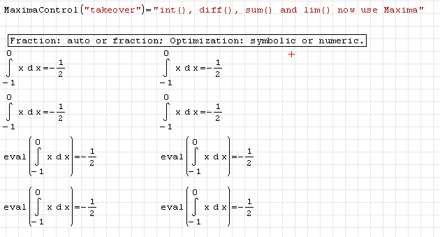 I don't know if this problem has been already reported, but I see some weird behavior with some simple integrals, this happen when I try different kind of optimizations (symbolic, numeric or none) at the same time I try different kind of fraction convertions(decimal, fracction or auto), when I try the eval function I get the same problem.
