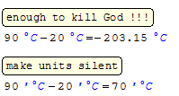 Hi. Martin it's wright about the need to use difference temperatures. The expression 90*'°C-20*'°C=-203.15@'°C in your example equals -203.15 Celsius because SMath don't store 90 nor 20 Celsius but store the equivalent values in Kelvins, and further do the difference. For this reason is why you need to use difference temperature units for get the expected value of 70 Celsius.