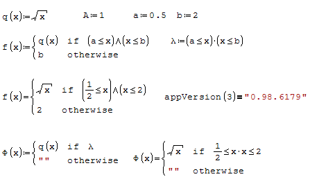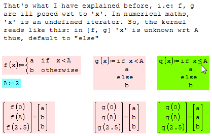 When f(x) is defined it sets f(x) equal to cases(a,xNote when g(x) is defined it will step through and evaluate the if() function and each individual input parameter (xThe cases() function within f(x) doesn't actually evaluate until it is called with f(0).