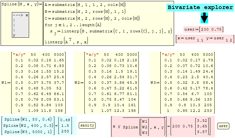 SMath Forum SMath Studio Samples Spline/Interpolate Matrix 1 Pages (3 items) Spline/Interpolate Matrix - Spline/Interpolate Matrix - Messages Go to last post #1 Posted: 11/22/2017 10:45:06 PM Jean Giraud 983 likes in 6,866 posts. Group: User Spline Matrix Tutorial METRIC Domain.sm (88.16 KiB) downloaded 743 time(s). 2 users liked this postfrapuano 11/23/2017 3:48:00 AM, sergio 11/23/2017 8:36:00 AM #2 Posted: 11/23/2017 8:39:27 AM Jean Giraud 983 likes in 6,866 posts. Group: User The bivariate "linterp" is reputed behaves like QuadraticSpline Matrix Tutorial METRIC Domain EXPLORER.sm (14.73 KiB) downloaded 679 time(s). #3 Posted: 11/23/2017 7:19:57 PM Nicolae Olaru 1 likes in 115 posts. Group: User Hello.I think I understand the idea. I will think about this. Thank you for your insistence. However, it also counted the very simple and schematic form you used here and you did not use it on the other subject. With respect and all the best. 1 Pages (3 items) New Posts No New Posts