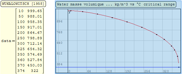 The plot below shows the Prode equation used for the liquid water density. It does well through out the data range, including near the critical point. The equation does not work with a reduced temperature of 1.