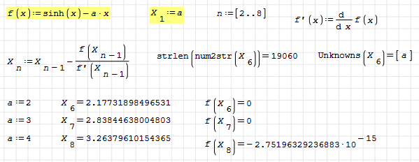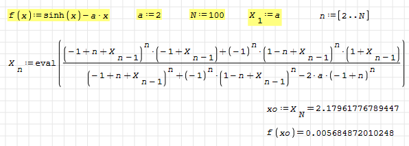 • For the starting value of the variable, you used simply the “a” value. For the starting point, I obtained a simple value based on the development of the second order of the hyperbolic sinus. Such a starting value diminish significatively the iteration number. You give arbitrarily a number of iterations; I control the convergence inside a “while” cycle.
