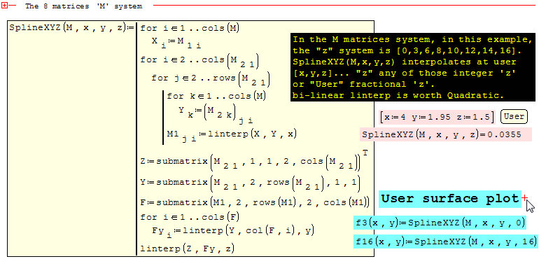 SMath Forum SMath Studio Samples Bi-linear Composite/Surface 1 Pages (1 items) Bi-linear Composite/Surface - Bi-linear Composite/Surface - Messages Go to last post #1 Posted: 4/25/2018 10:03:28 AM Jean Giraud 983 likes in 6,866 posts. Group: User This bi-linear tool interpolates in the surface itself integer 'z'and between two 'z' matrices where 'z is fractional'. 1 Pages (1 items) New Posts No New Posts