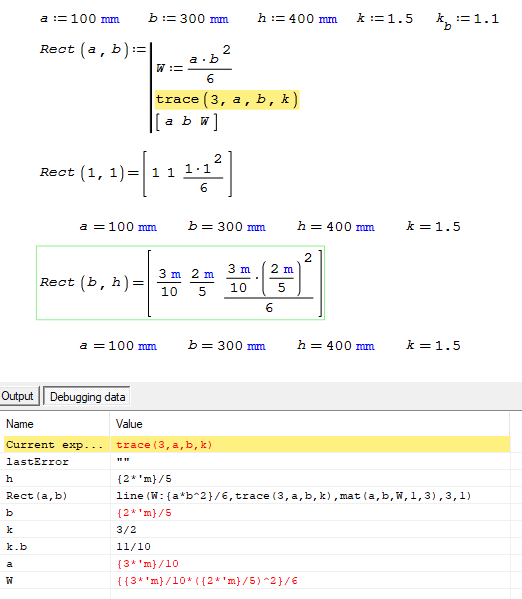 Almost all programming languages include debugging procedures. SMath, owing a high transparence and friendly design process, is naturally less indebted to an eventual debugging process. A special case is inside functions.