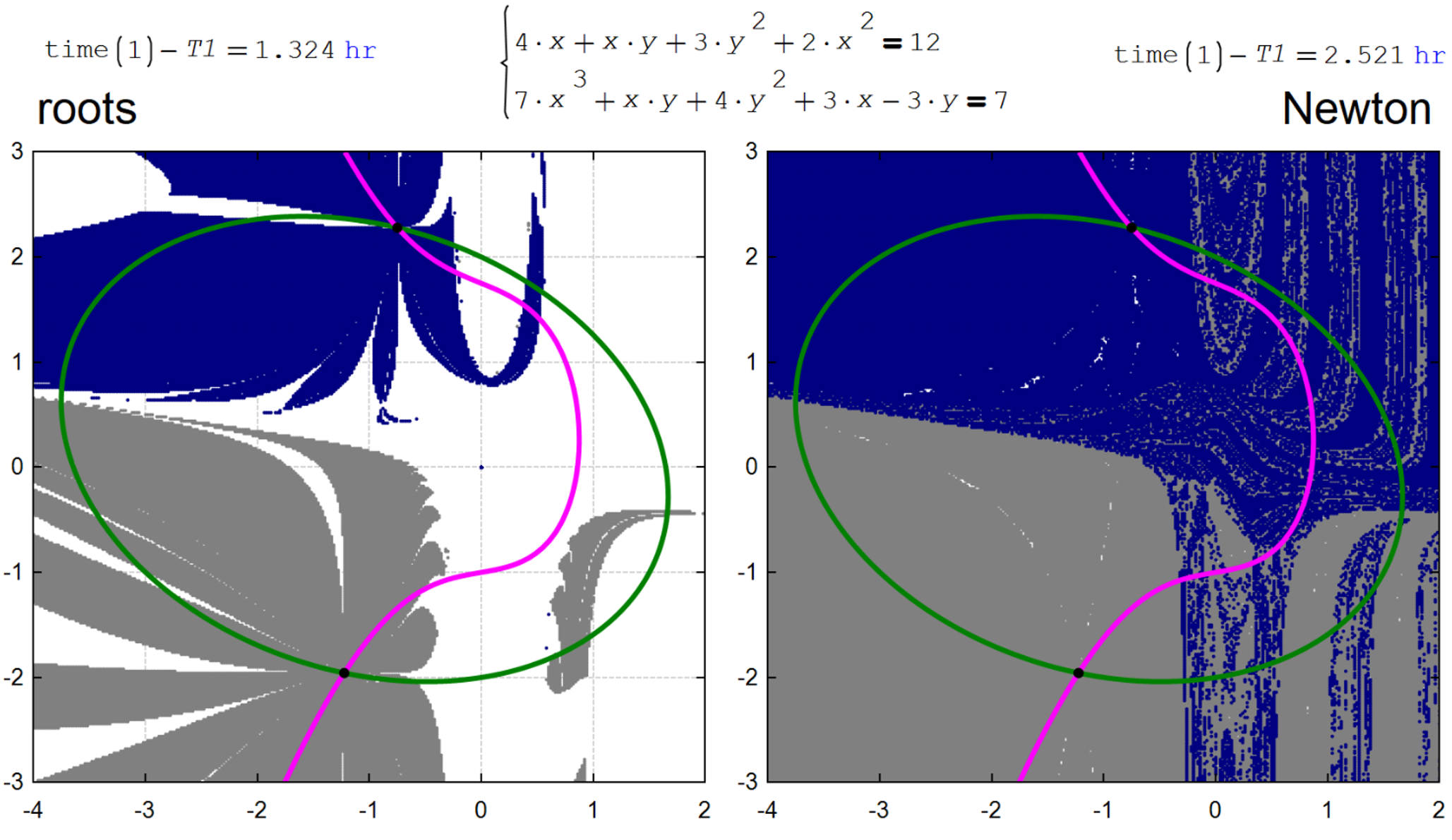 mNewton() from the Maxima plugin is another option. It also may fail for particular initial guess values.
