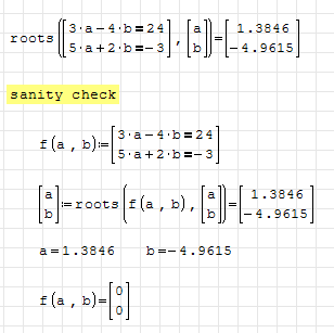 unfortunately, your sanity check isn't good, because the result f(a,b )=[0;0] says the opposite: it's the result of logical expressions "is 3*a-4*b equal to 24? No (0)!" and "is 5*a+2*b equal to -3? No (0)!"