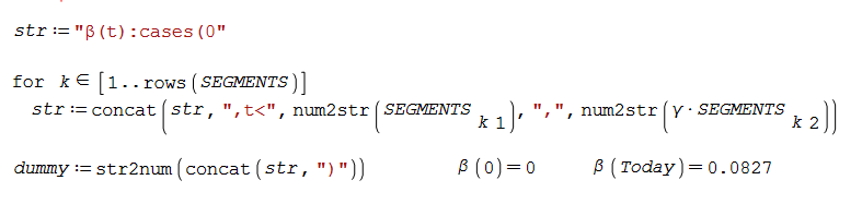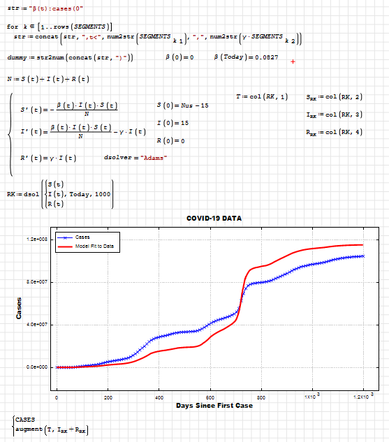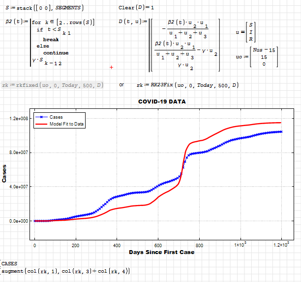Nevertheless, my example below demonstrates that the SEGMENTS data is not getting into the ODE formalism. Look down through the file and you will see that I have arbitrarily changed the final Ro to an absurd value of 20. Now, even the TDFD does not fit the last data point. But there is no change to the ODE solution; therefore, it's not getting the change and thus it cannot fit the data. Ro in each segment was adjusted to get a good fit to the data over the data range provided, usually days or weeks. If you put the best fit value back into the last Ro, the fit goes back to an excellent fit at the last data point. Further down in the file, you can see the actual difference between the model and the data. With the best fit Ro, the difference is about 8E-5, clearly less than a person. If Ro = 20, the difference is about 37 million people.