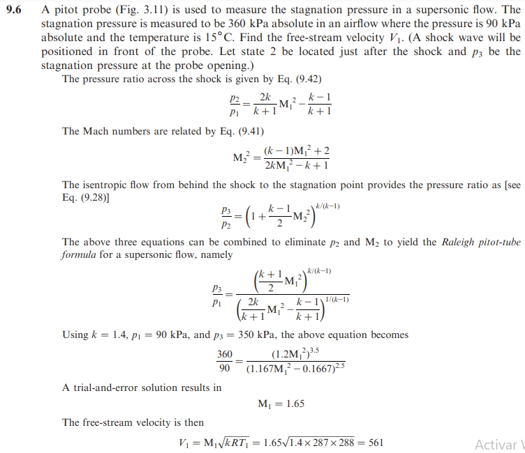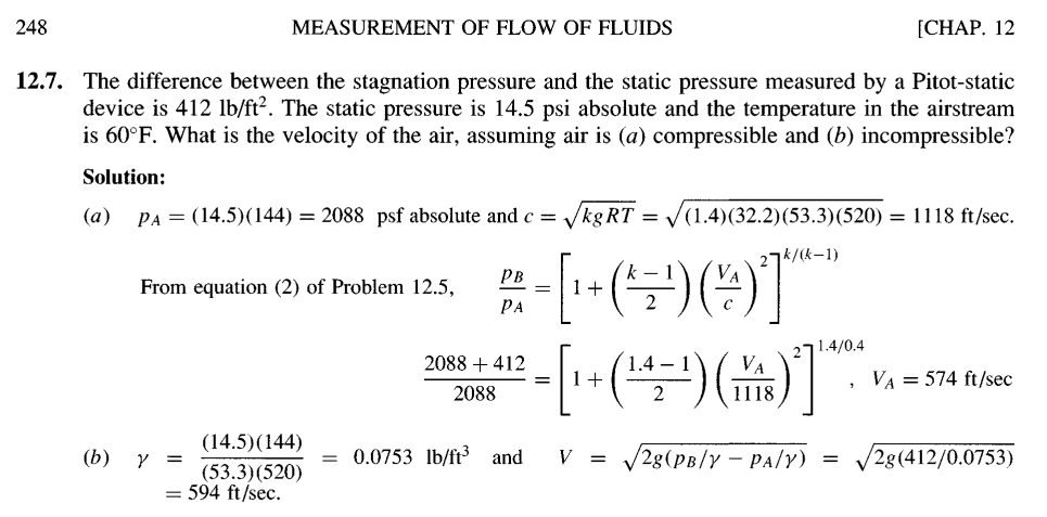 From the same publisher, but now Fluid Mechanics with hydraulics and others authors, more or less the same calculation with Pitot, another little gem: lb/ft^2 as a unit of pressure, but they can also call it psf, I guess depending on his mood. When they don't clarify lbf or kgf it's just a matter of time before they get a force wrong by a factor of 10 at some point.