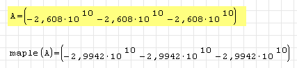 By direct evaluation seems a 1x3 null matrix (in blue in the worksheet), but if you assign the values to a variable returns a 1x3 matrix with large values (in yellow)