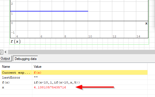 Wrotethink the issue is the auto-generated range does not include the point x=10 exactly and therefore never reaches the point where f(x) = 5