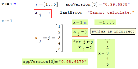 WroteThis is because implicit assignment loops by vectors are available since SMath Studio 0.99.6638, in previous versions it's invalid syntax.