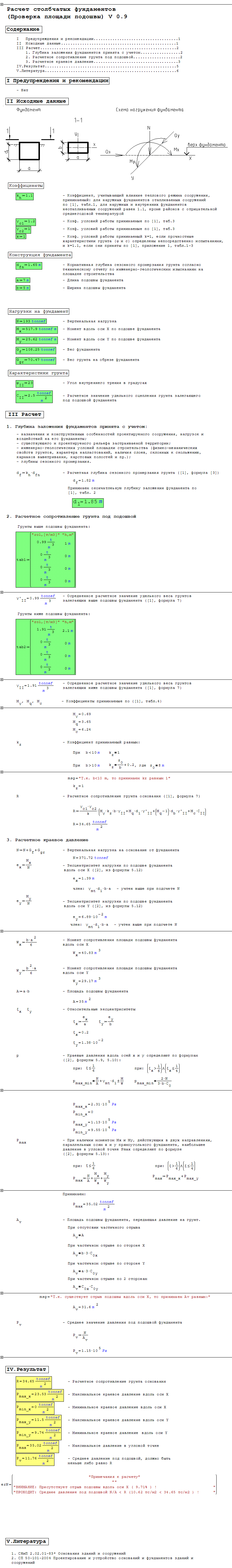 Форум SMath SMath Studio Примеры использования Пример расчета мелкозаглубленного столбчатого фундамента 1 страниц (1 вхождений) Пример расчета мелкозаглубленного столбчатого фундамента - Сообщения К последнему сообщению #1 Опубликовано: 04.10.2011 13:53:53 Mikka 36 сообщений из 206 понравились пользователям. Группа: User Пример расчета мелкозаглубленного столбчатого фундамента без армирования Не официальный справочник http://sites.google.com/site/mikkhalichlab/ jabber конференция smath@conference.jabber.ru 4 пользователям понравился этот постAndrey Ivashov 04.10.2011 14:03:00, Fridel Selitsky 04.10.2011 18:13:00, Serg 11.06.2012 06:54:00, Николай Цопа 21.03.2020 04:59:00 1 страниц (1 вхождений) Новые сообщения Нет новых сообщений