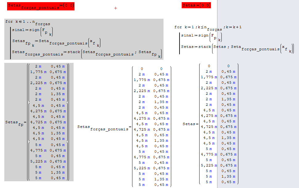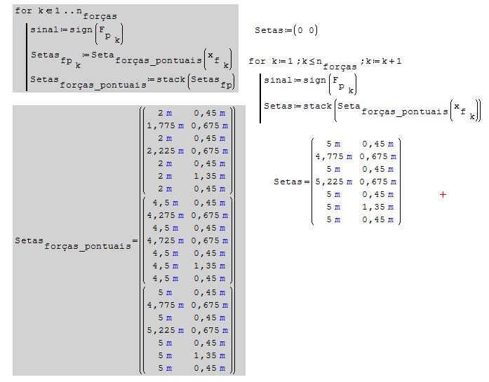 I'm trying to use the stack function to put all rows of a loop in a single matrix, just like is in Beam.sm, but, the result isn't the same. I attached an image, where in the left side there's the best code I managed to do at the moment (gray), and in the right side is a code which is basically a copy of the code in the example, but using my functions. The code in example only show the last iteration, while my code have a vector of submatrices. None is the desirable answer.