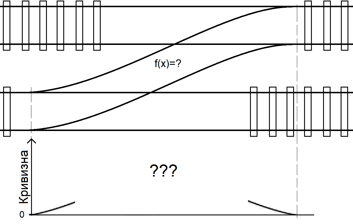 For the connection of two parallel tracks (crossover) you need two turnouts with (signed) curvature changing from zero to maximum back to zero to negative maximum and again back to zero. In the paper cited below various types of transition curves are given. The mmost popular one is the clothoide with a linear change of curvature with arc length (case 1 in the table). It produces much better transitions than just connecting straight segments and circular arcs (which for moderate speeds up to 50 km/h still is state of the art). More sophisticated transition arcs have been proposed because usually there is a superelevation (Überhöhung, возвышение) of the track to compensate for lateral acceleration.