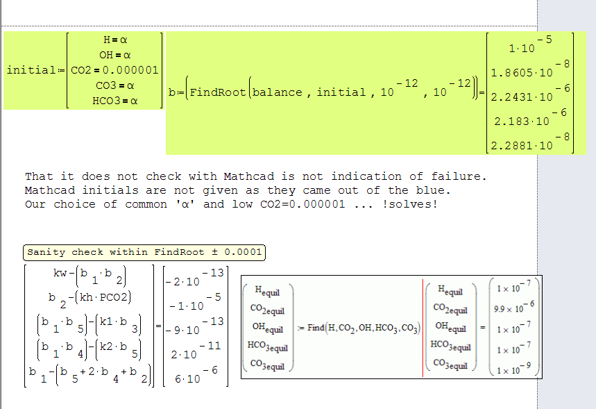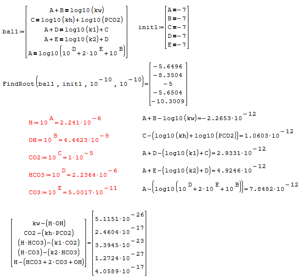 Moreover, the Mathcad solution is more agreeable (for example, H.equil=OH.equil=10^-7). Carbonic acid is the subject, our solution will indicate that this is stronger acid than expected - which is not the case.