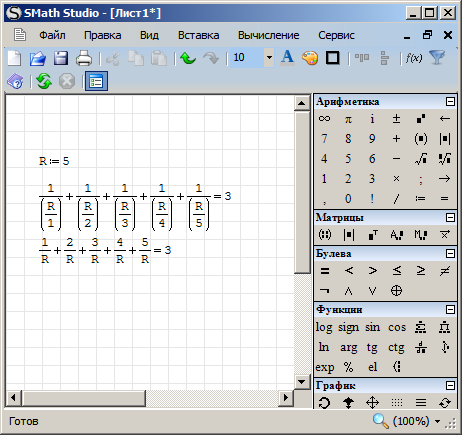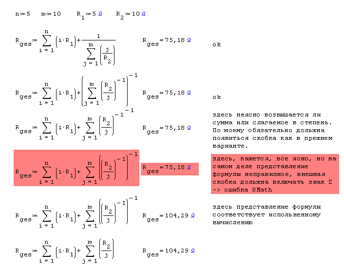 Но потом полученную сумму (т.е. электропроводность) нужно преобразовать в сопротивление, т.е. взять обратную ей величину. Поэтому результат суммирования возведён в степень [MATH]-1[/MATH]. Именно результат суммирования, это можно увидеть при просмотре формулы: sum(((R,2/k)^{-1});k;1;m)^{-1}. Это упустил mikka, когда отвечал Вам, но, по правде говоря, Вы должны бы сами находить такие огрехи, так что того, что Вам указали направление, уже должно быть достаточно. Кстати, OchkovVF совершенно резонно заметил, что это стало бы очевидно при использовании единиц измерения: программа не позволила бы суммировать сопротивление и электропроводность.