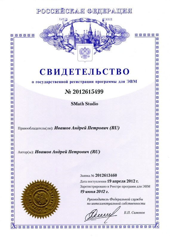 Форум SMath Общение О проекте Официальные документы 1 страниц (1 вхождений) Официальные документы - Сообщения К последнему сообщению #1 Опубликовано: 28.06.2012 15:01:15 Andrey Ivashov 2 315 сообщений из 3 937 понравились пользователям. Группа: Super Administrator Получено свидетельство о государственной регистрации программы для ЭВМ SMath Studio. 12 пользователям понравился этот постDavide Carpi 28.06.2012 17:20:00, Radovan Omorjan 29.06.2012 04:14:00, уни 29.06.2012 08:12:00, Mikka 29.06.2012 10:18:00, Медведев Виктор 29.06.2012 11:24:00, Valey 30.06.2012 02:33:00, Serg 16.07.2012 13:23:00, tca 07.08.2012 14:32:00, Rubidy 29.11.2012 15:17:00, XroM 09.04.2013 12:25:00, Сергей 17.06.2013 06:43:00, VoXter 08.11.2014 16:41:00 1 страниц (1 вхождений) Новые сообщения Нет новых сообщений