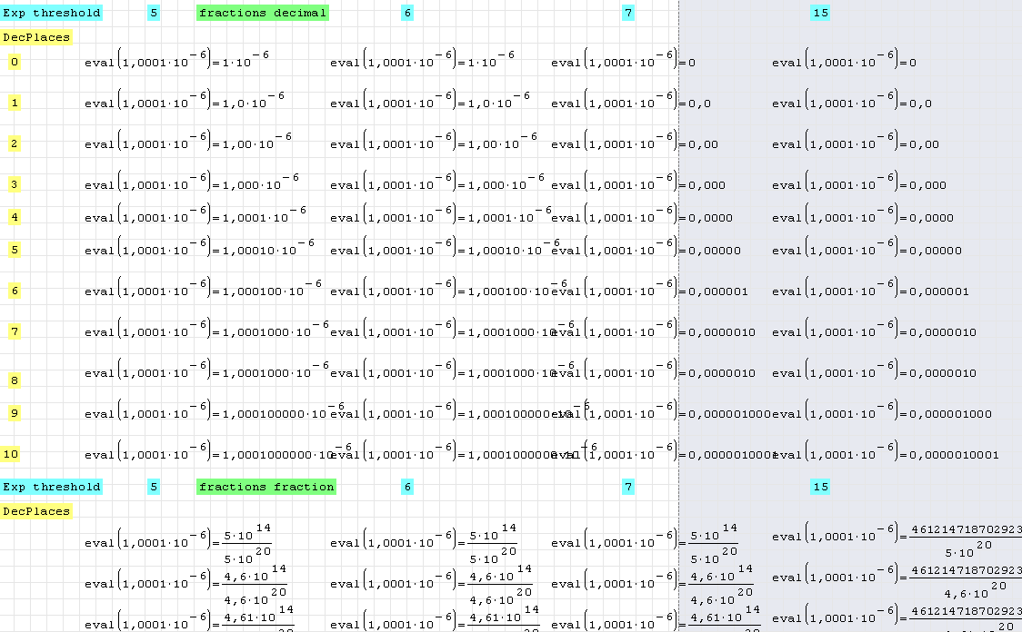 I noticed that the output of the eval() function is related in some way to the decimal places setting... Don't know if it's a bug or a feature, but seem it's not a rule (see the screenshot)