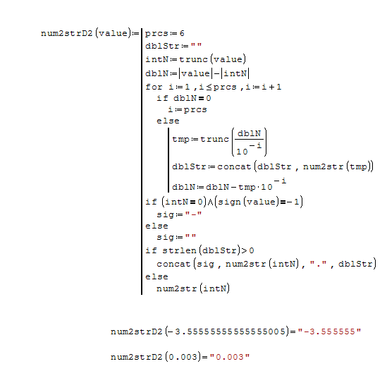 Вот мой вариант такой функции, внутри функции в 1 строке объявлена константа prcs, это максимальная точность после запятой!