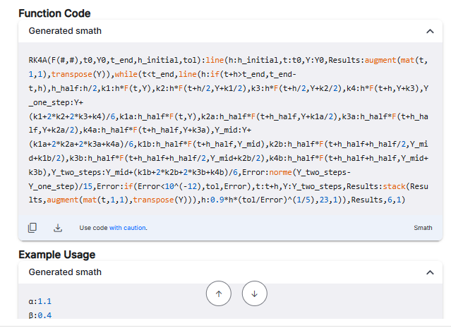 Hi Martin. You can try this code utility ( https://smath.com/en-US/forum/topic/GbopVw/Code-utility#msg137576 ) for scripting SMath functions. By relying on plain text, the AI will be able to provide some form of useful source code for basic applications.