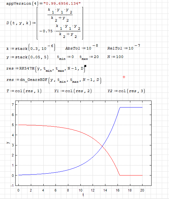 Thank you for some more ODE solvers. However, I could not resist to mention my favorite db_GearsBDF() which can escape the problem when y2 approaches zero. I mentioned this stiff example long time ago and you were using it often (kinetic2.sm example here). Unfortunately, it seams GearBDF() from this plugin can not overcome zero values and gets into the negative ones like most of the solvers.