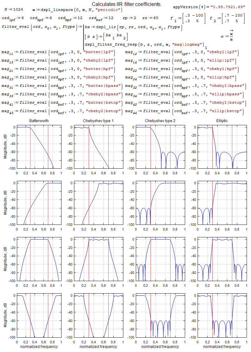 dspl_iir(6) - (rp,rs,ord,w0,w1,ftype) calculates the coefficients of the digital IIR filter transfer fucntion H(z).