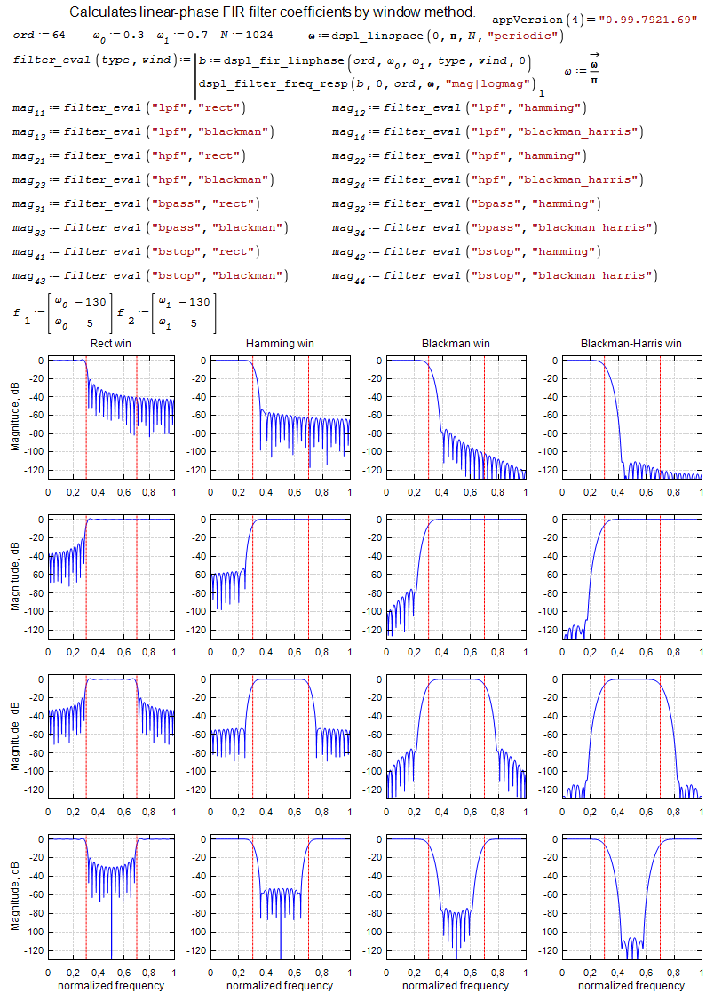 dspl_fir_linphase(6) - (ord,w0,w1,ftype,wtype,wprm) calculates linear-phase FIR filter coefficients by window method.