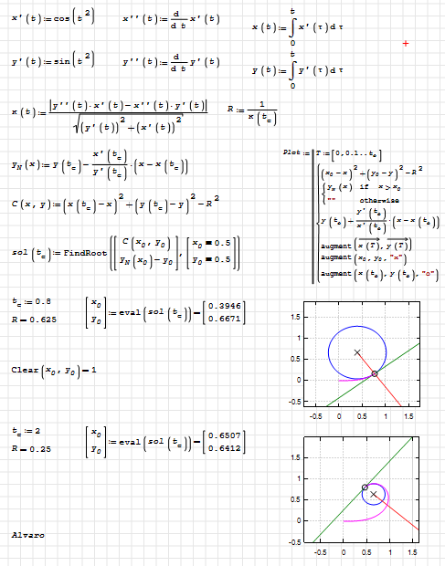 SMath Forum SMath Studio Questions Mathcad2SMath 1 Pages (4 items) Mathcad2SMath - Euler Spiral - Messages Go to last post #1 Posted: 5/17/2025 6:08:25 PM Valery Ochkov 66 likes in 672 posts. Group: User How can I do it in SMath Edited 5/17/2025 7:14:32 PM #2 Posted: 5/19/2025 4:34:18 AM Alvaro 1,081 likes in 1,754 posts. Group: User Hi Valery. This could be a way.Best regards.Alvaro.Euler-Spiral.sm (23.92 KiB) downloaded 1113 time(s). Edited 5/19/2025 6:48:22 AM 7 users liked this postNDTM Amarasekera 5/19/2025 2:25:12 PM, overlord 5/22/2025 1:37:39 PM, Andrey Ivashov 5/19/2025 9:18:07 PM, sergio 5/19/2025 8:17:44 AM, ioan92 5/20/2025 7:37:23 AM, francesco rapuano 5/19/2025 10:31:40 AM, Davide Carpi 5/22/2025 6:34:13 AM #3 Posted: 5/22/2025 3:48:34 AM Alvaro 1,081 likes in 1,754 posts. Group: User Animating.Euler-Spiral Forum.sm (33.9 KiB) downloaded 1058 time(s).Best regards.Alvaro. 6 users liked this postAndrey Ivashov 6/3/2025 1:57:58 PM, Davide Carpi 5/22/2025 6:34:04 AM, Вячеслав Мезенцев 5/22/2025 7:18:38 AM, overlord 5/22/2025 1:37:41 PM, NDTM Amarasekera 5/24/2025 2:59:28 AM, Oscar Campo 5/27/2025 12:10:37 PM #4 Posted: 5/22/2025 1:36:08 PM overlord 587 likes in 1,360 posts. Group: Moderator This man is a wizard. 1 users liked this postAlvaro 5/23/2025 1:14:24 AM 1 Pages (4 items) New Posts No New Posts