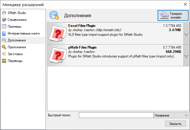 Application can be easily extended based on your needs. Built-in Extensions Manager tool allows to get access to hundreds official and third-party resources of the following types: usage examples, plug-ins, SMath Viewer based applications, snippets, interface translations, interactive books, handbooks and tutorials.