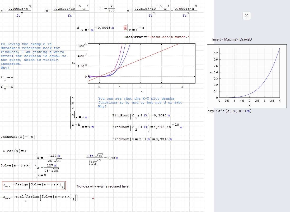 The plot problem is due to unit mismatch. Note that in plots, the independet variable always gets unit-free values (except in Maxima Draw plots, if you specify limits with units). Thus you have to make sure that the functions to graph get arguments with the correct dimension. If you define the function explicitly, then something like a(x m) will work. If it is just an expression, then use the substitution operator at() from the Custom Functions plugin.