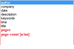 WroteIs there a way to add or implement more "field" items? I'd like to see page number, page count, and even user defined. At the moment, I am using keywords to input a project number