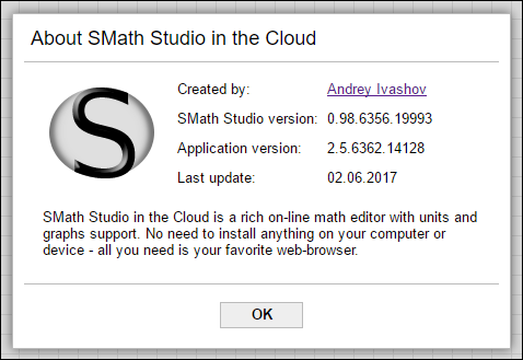 About dialog contains date of the last update and version of the SMath Studio Core used on server-side (it will always correspond to the latest available SMath Studio version if nothing critical is found there).