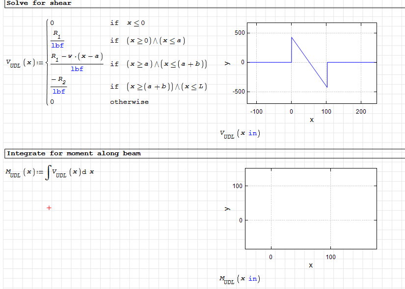 The piecewise equation for shear is pretty simple and I am able to plot V(x). But I am running into trouble integrating it to get M(x). I know that the built-in integration tool sometimes has trouble with units, maybe that's the error that I'm running into? I appreciate any help!