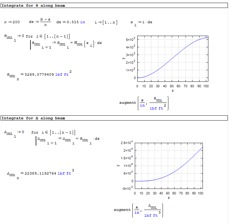 StvMath, I get a similar error with your file: "X is undefined". Also your plots for theta and delta don't match up with what you would expect. For the uniformly distributed load entered at the top of the spreadsheet, delta should be roughly parabolic. Numerical integration gives the values for total area under the curve along the beam, which isn't a helpful value for this use case.