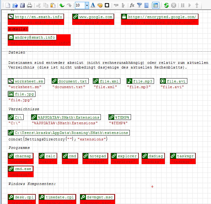 If I copy them to my handbook page, I get "System can't find the file" messages for the links marked with red background, both documents in the same instance of SMath. No matter if portable or installed distribution...