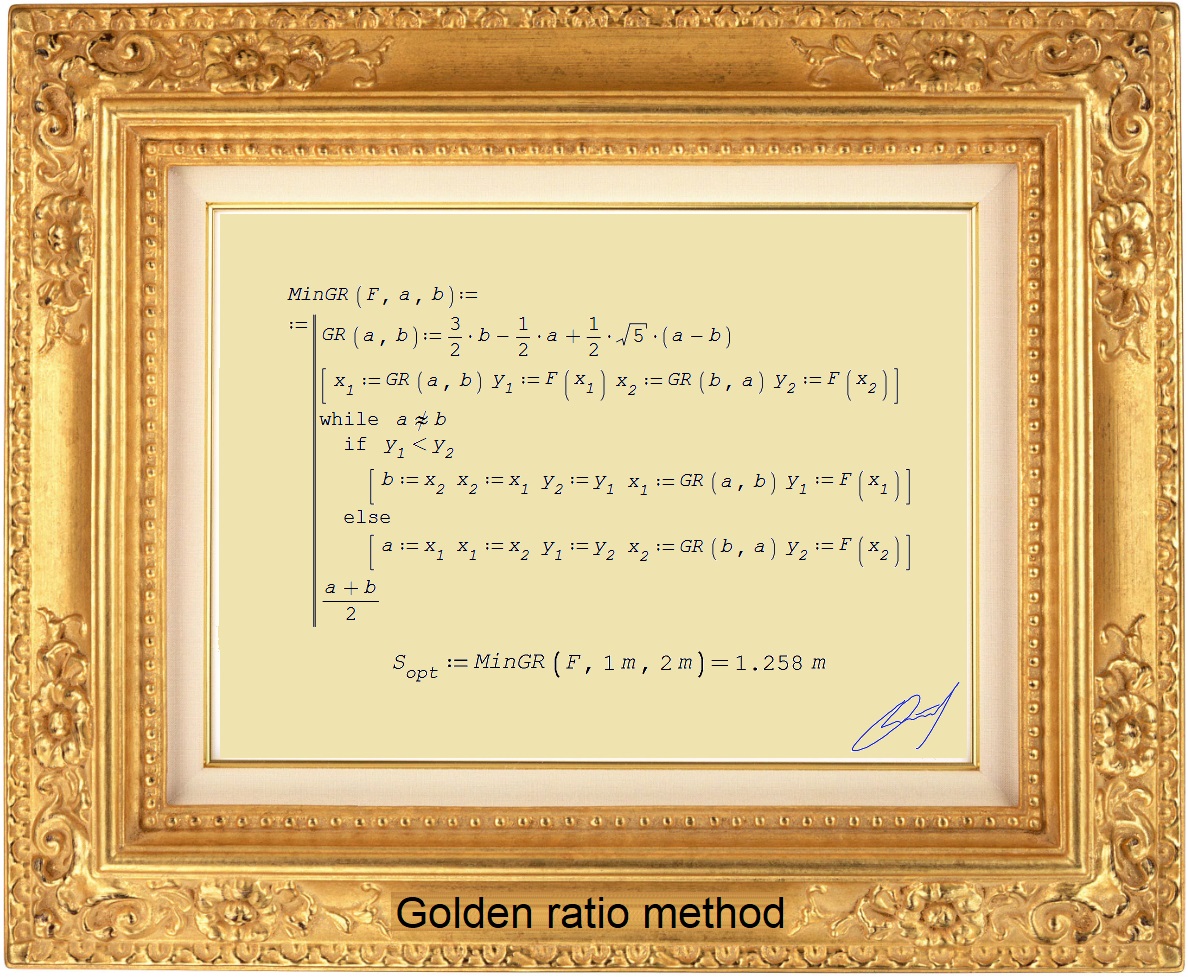 SMath Forum SMath Studio Samples Golden Ratio Method 1 Pages (3 items) Golden Ratio Method - for y(x) minimize - Messages Go to last post #1 Posted: 5/3/2023 3:08:07 AM Valery Ochkov 66 likes in 672 posts. Group: User 3-MinGR.sm (8.97 KiB) downloaded 1071 time(s). #2 Posted: 5/3/2023 8:15:21 AM Jean Giraud 983 likes in 6,866 posts. Group: User No need for approximately = ... decrease TOL as needed.Lot more in there: roots, discrete Golden, Dichotomy ... Cheers ... JeanGolden ratio QUICK.sm (130.08 KiB) downloaded 1016 time(s). #3 Posted: 5/3/2023 9:43:06 AM Jean Giraud 983 likes in 6,866 posts. Group: User ... if your function is not symbolic differentiable for 'roots':spline(s), all Smath based built-in ... Instead of 'roots' use solve(4) 1 Pages (3 items) New Posts No New Posts